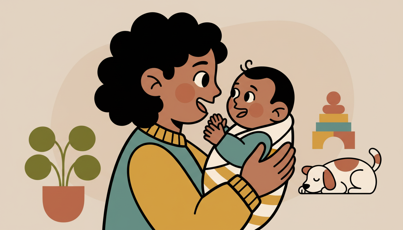 Hold your child close so your faces are about eight to twelve inches apart. When your child shows an emotion, gently mirror it back with your own face. If they smile, smile warmly back. If they look concerned, soften your expression with care. This simple exchange helps your child begin to understand emotions through your responsive presence.