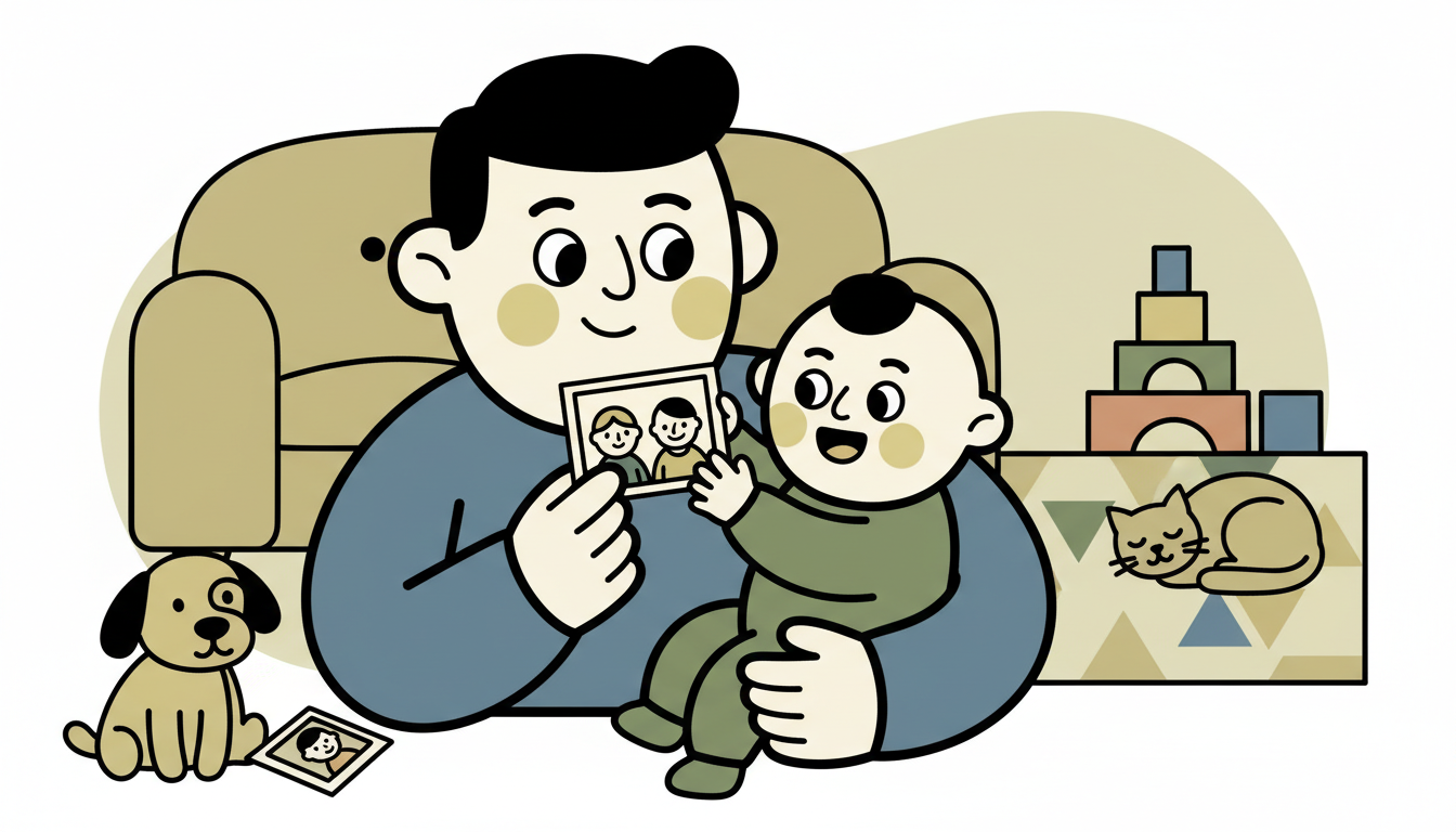 Show your child photos of family members and close friends. Hold each photo about 8-12 inches from your child's face. Name each person warmly and tell your child something simple about them. You might say, this is grandma who loves you, or this is your aunt who can't wait to see you. This expands your child's social world beyond who they see daily.