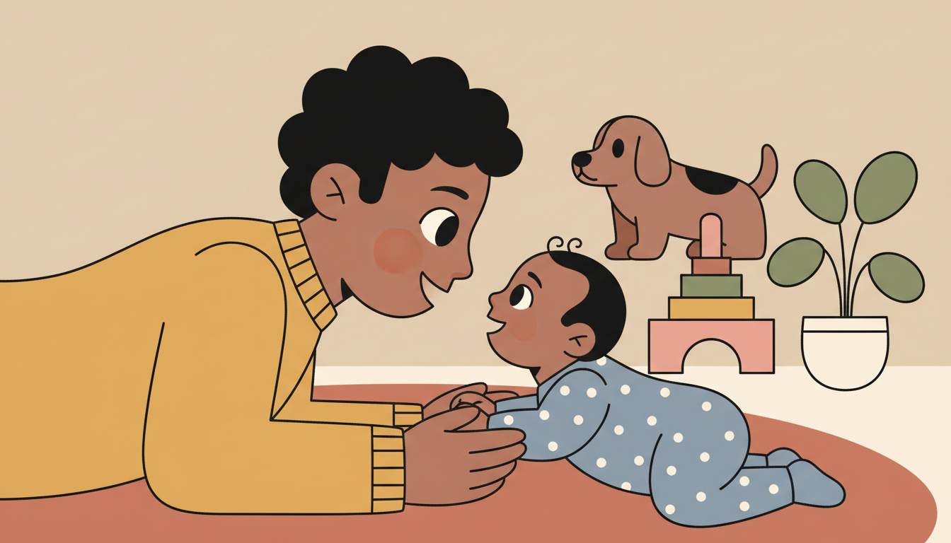 Lie down with your child or hold them at a comfortable distance where you can see each other's faces clearly. Smile gently and wait to see if they smile back. Make simple sounds or expressions and watch how they respond. Follow their lead about how long to continue.