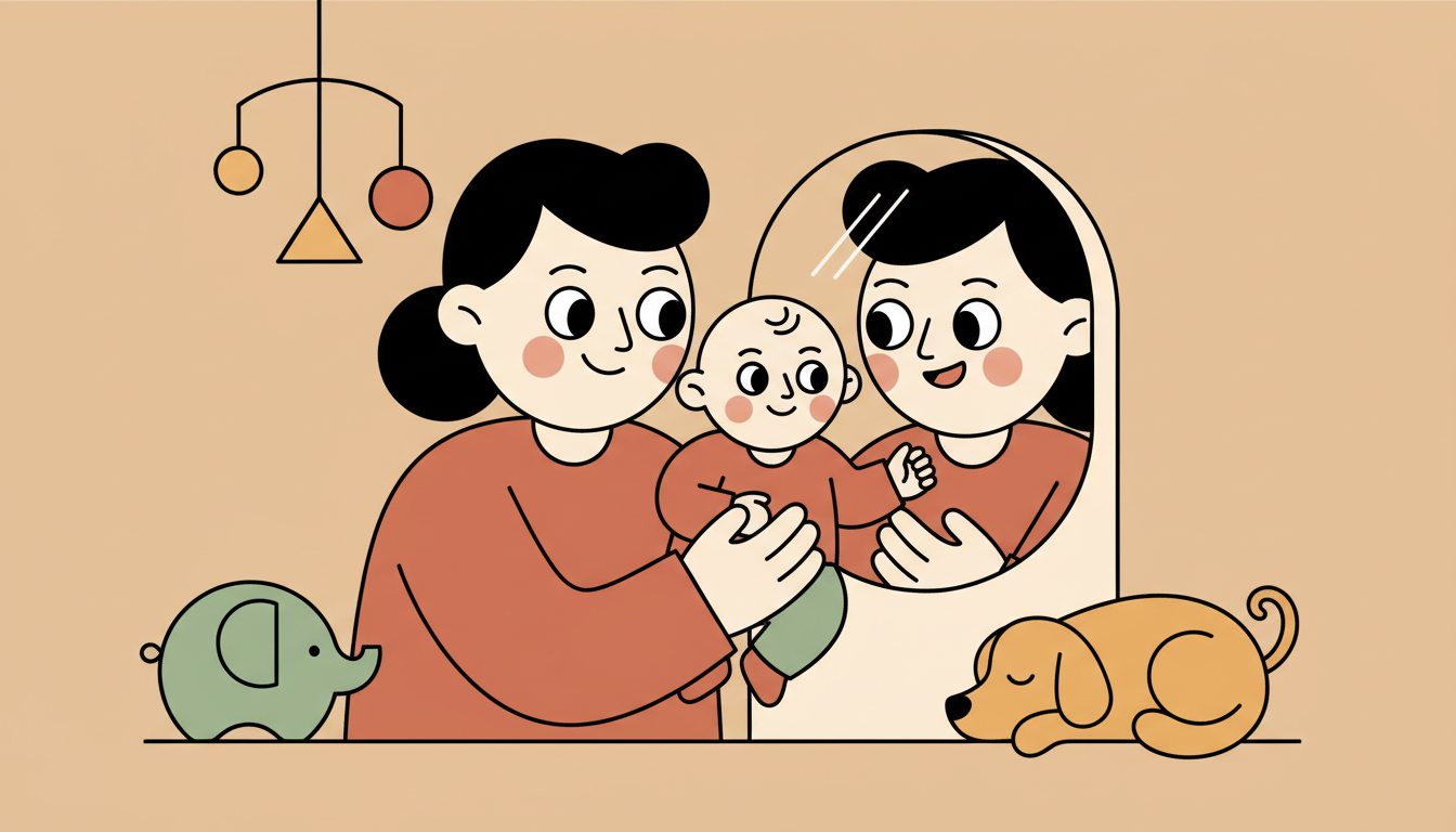 Hold your child in front of a mirror during a calm moment. Make gentle facial expressions and wait for them to respond. Try a smile, then a surprised face, then back to calm. This helps them see emotions change and return to baseline. Name the emotions simply like happy or surprised. This early emotion recognition supports their developing ability to understand and regulate feelings.