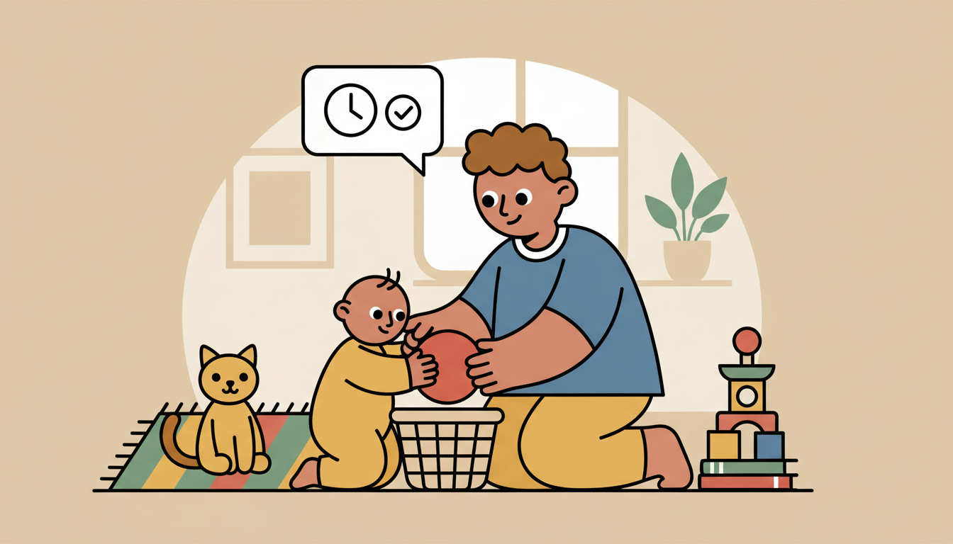 Keep cleanup very brief at this age. One toy is enough to establish the pattern.