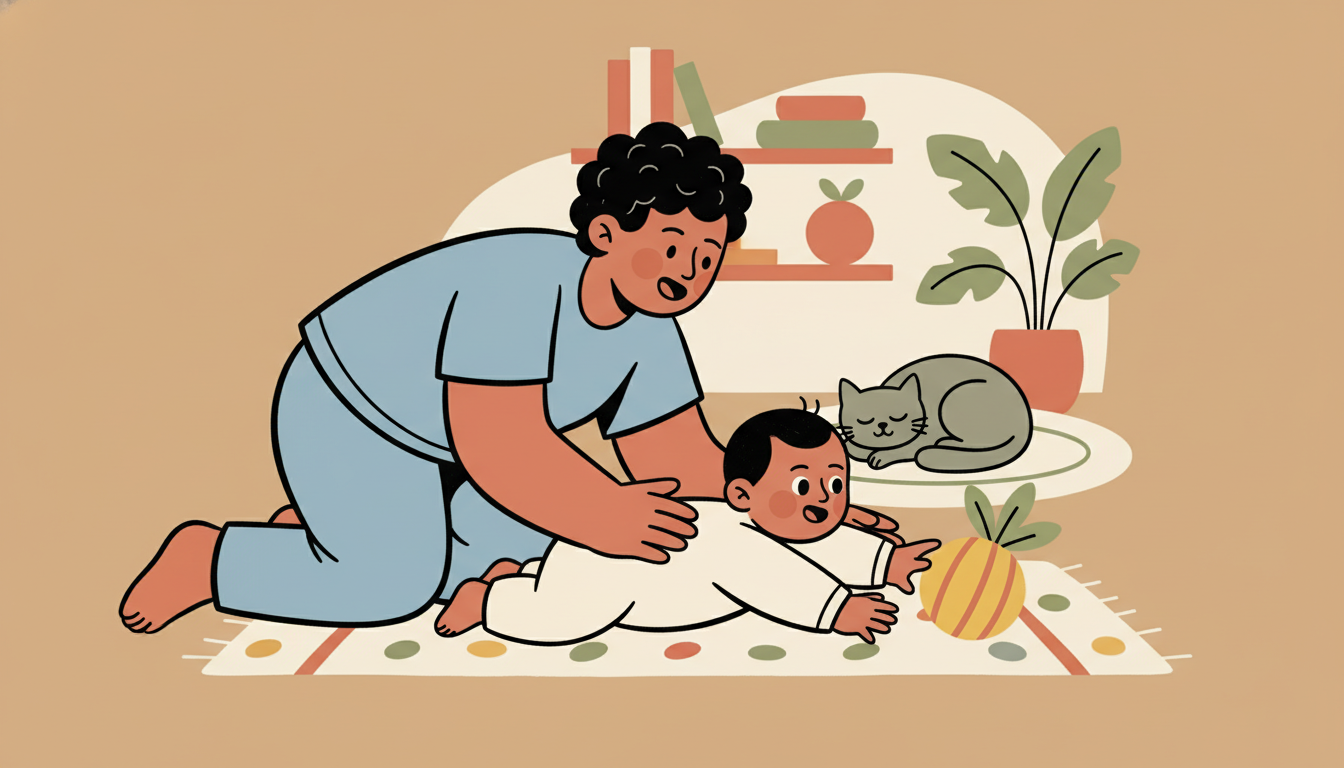 When your child is working on rolling over, place a toy to one side to encourage the movement. Let them struggle gently for 20-30 seconds before offering physical help. Use your voice to encourage them throughout. If they succeed, celebrate warmly. If they do not make it, help them complete the roll and try again later. This teaches persistence and recovery.