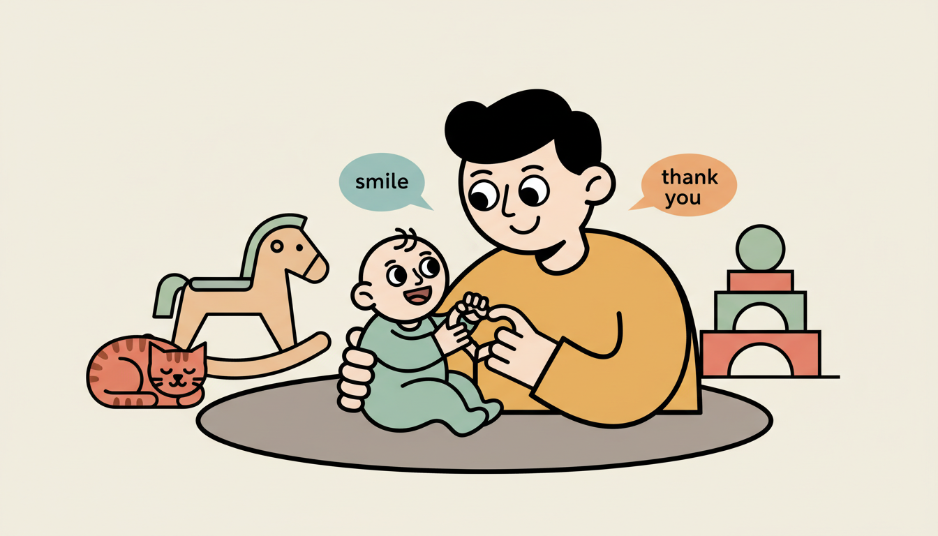 When your child smiles at you, respond by saying 'Thank you for that beautiful smile' or 'I appreciate your happy face.' Smile back warmly. This creates a back-and-forth exchange where your child learns their actions have positive effects. Keep the interaction simple and warm.