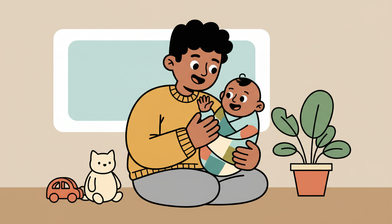 When someone arrives or leaves, hold your child's hand and help them wave while you say hello or bye-bye. Even though they can't wave on their own yet, experiencing the gesture paired with the social situation teaches them about greetings. Around five to six months, you can wave yourself and watch to see if they start to imitate the movement.