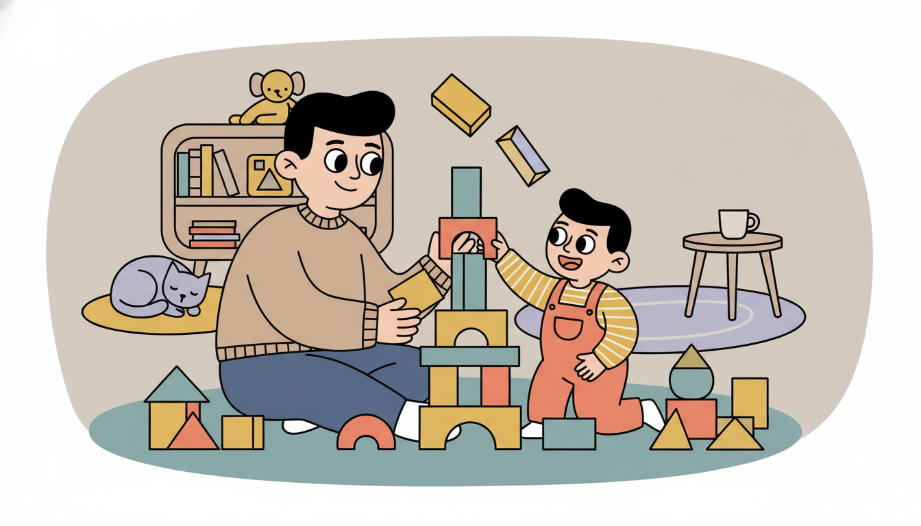Sit on the floor with your child and a set of blocks. Take turns placing blocks on a growing tower. You place one block and say "my turn," then encourage your child to place the next block and say "your turn." Celebrate together when the tower gets tall, and laugh together when it falls down. Hand blocks to each other, creating opportunities for receiving and giving. This shared building project teaches cooperation and the joy of creating something together. The process matters more than making a perfect tower.