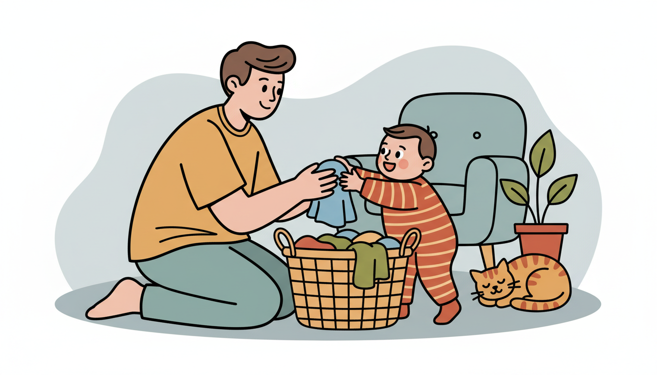 During laundry time, ask your child to help by putting dirty clothes into the laundry basket. Hand them one piece of clothing at a time or let them pick items from a small pile. Say thank you and smile as they drop each piece in. This real household task shows your child they can help the family in concrete ways.