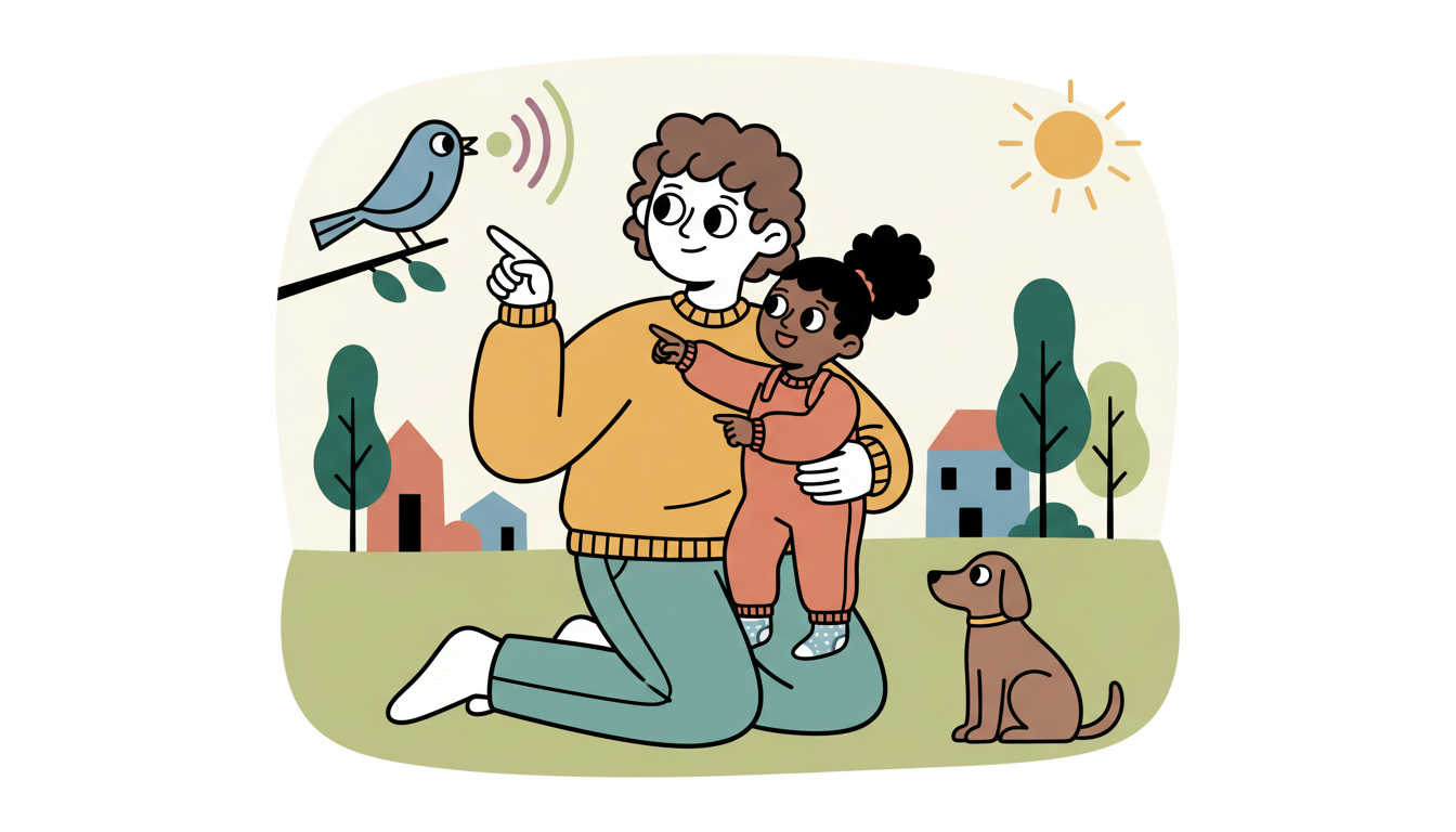 Take short walks and point out sounds you hear together. Say listen and pause. Then name the sound like bird, car, or dog. Wait to see if your child points toward the sound or tries to repeat the word you said.