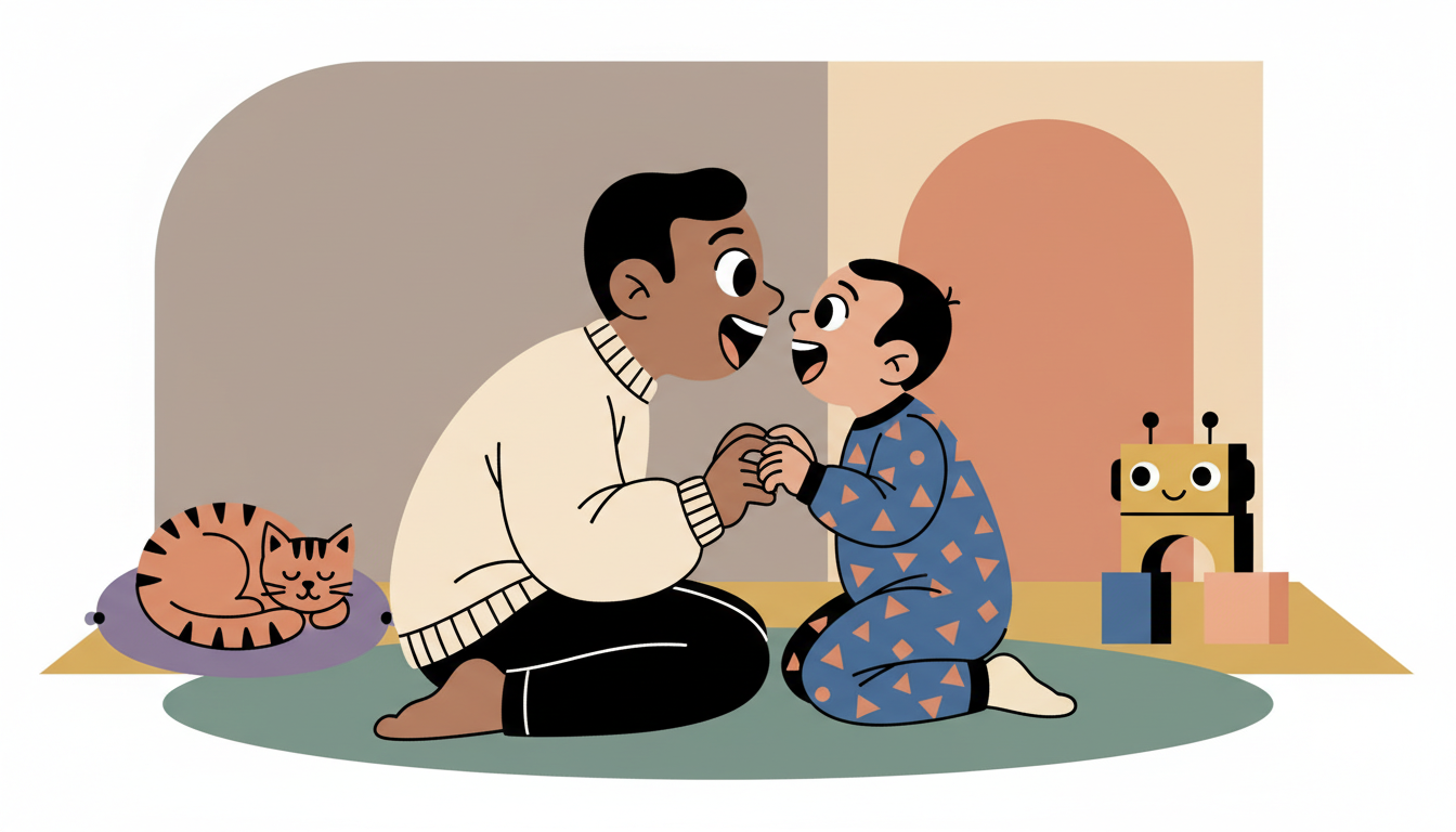 Sit face to face with your child and make simple expressions like smiling, opening your mouth wide, or sticking out your tongue. Wait to see if they imitate you, then copy what they do back. This creates a conversation without words. Your child learns that their actions get responses and that social interaction is a two-way exchange.