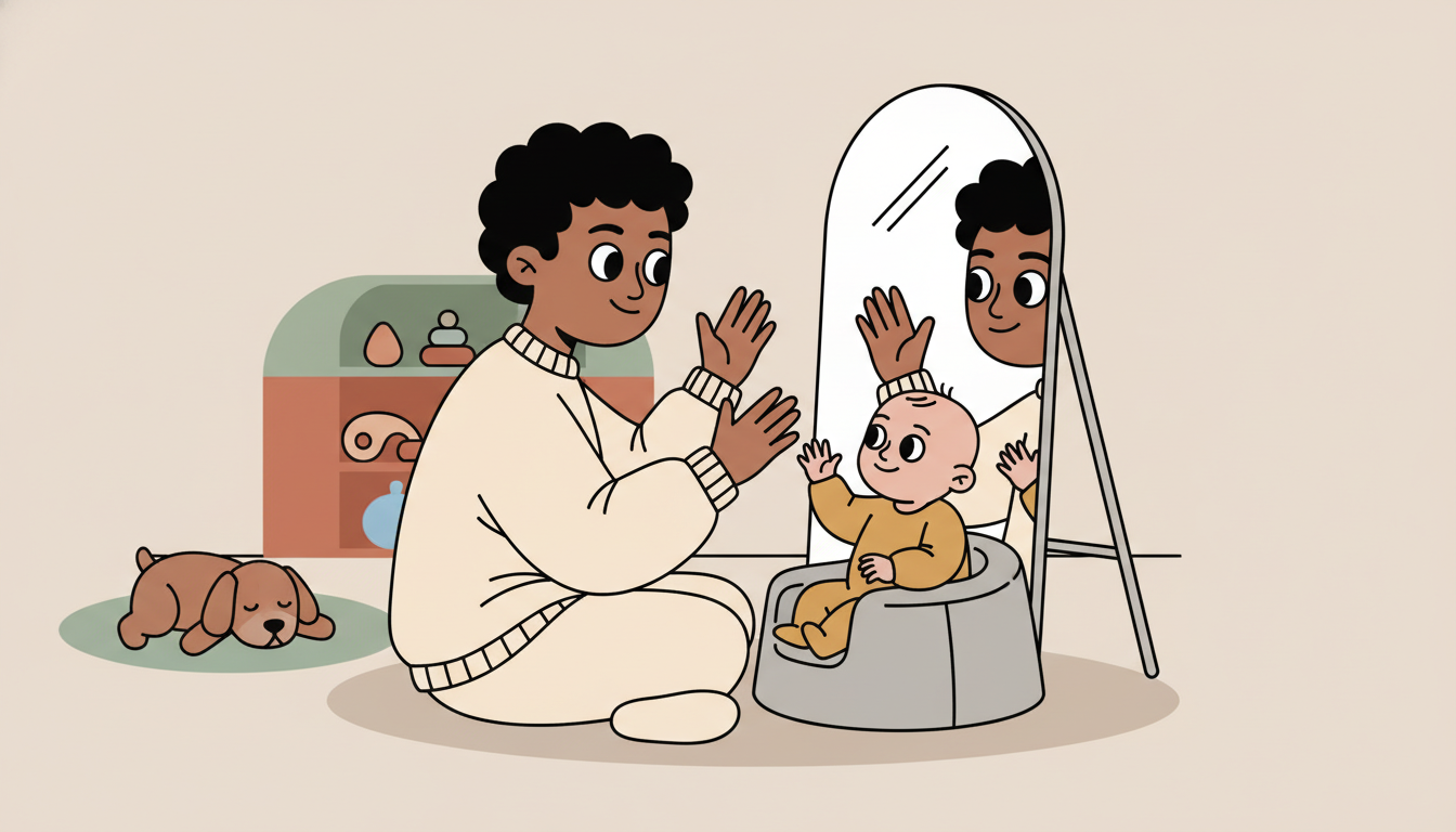 Sit with your child in front of a mirror. Make simple gestures like waving or clapping and see if they imitate you. When they try, even if the movement isn't perfect, describe their effort: 'You're moving your hands like me' or 'You're watching and trying.' Take turns so they can lead and you can imitate them too.