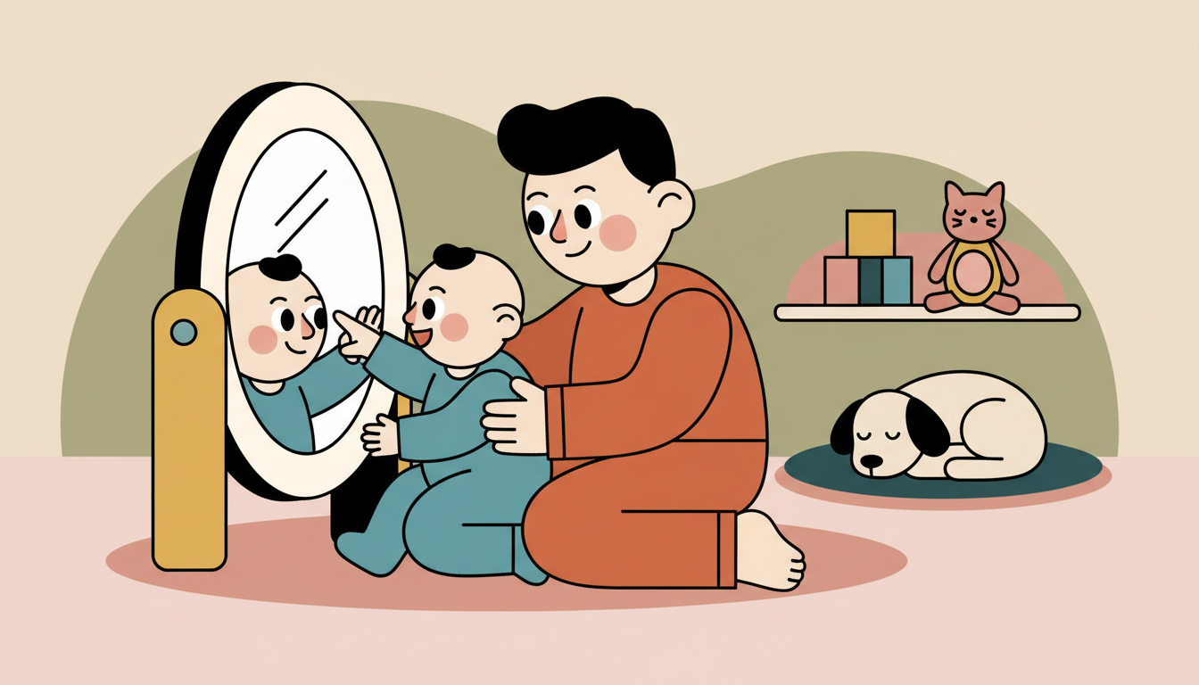 Sit with your child in front of a safe mirror. Let them see themselves and you together. Point to them in the mirror and say their name. Touch their nose, then point to their nose in the reflection. Wave and watch them notice the movement. This helps them begin recognizing themselves as a distinct person who exists and matters.