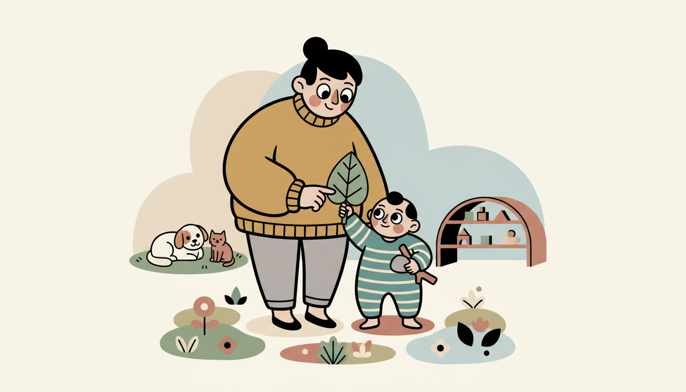 Go outside and look for simple things together. Point out a leaf, a rock, a flower, or a stick. Let your child pick them up and carry them. Walk slowly and stop often. The movement happens naturally as they explore and collect.