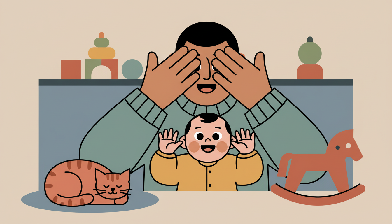 Play peek-a-boo with your child by covering your face with your hands or a cloth and then revealing yourself. Wait for your child to react before repeating. This simple game teaches turn-taking and builds social expectations. Your child learns that interactions follow predictable patterns. The game creates moments of shared joy and connection.