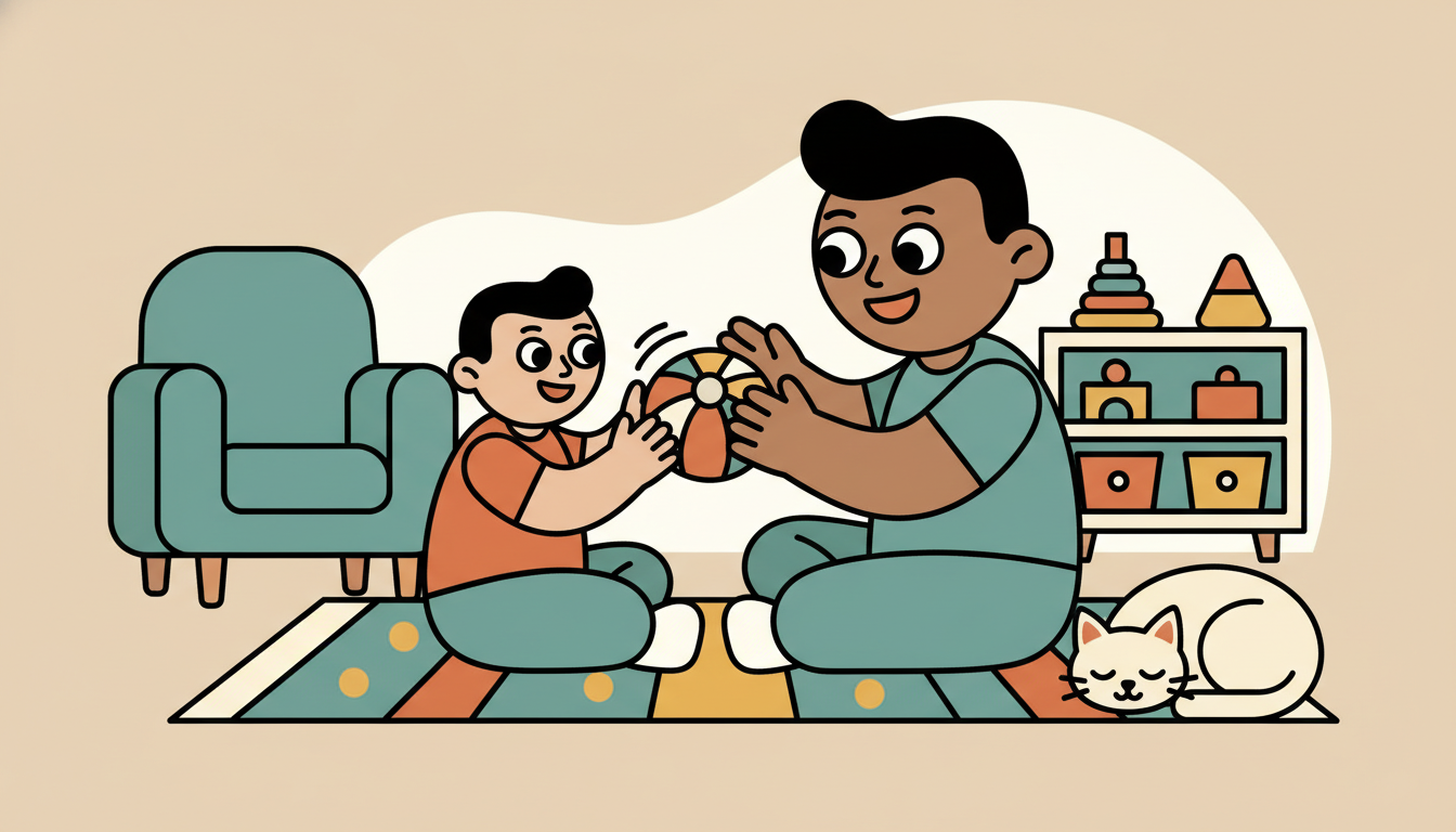 Sit across from your child and gently roll a soft ball back and forth between you. Take turns being the sender and receiver. Celebrate each successful catch or roll with a smile or gentle clap. This creates a simple cooperative game that your child can understand. The predictable pattern helps them learn about taking turns.