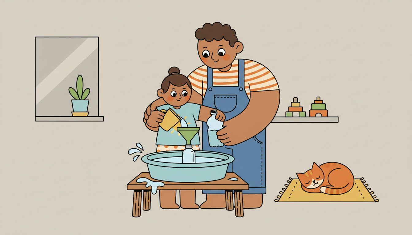 Keep cleanup supplies nearby and expect spills. Your calm response to mess teaches your child that mistakes are manageable. Use this time to practice two-step instructions like, 'Fill the cup, then pour it in the bowl.' This matches their cognitive abilities. Point out their progress. Say, 'You're getting more water in the bowl now,' which highlights improvement through practice.