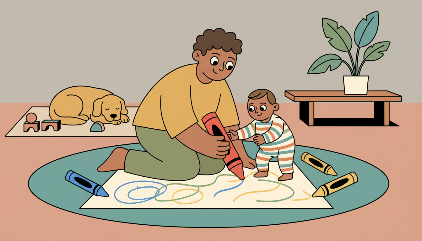 Give your child a large crayon and paper. Show them how to make marks. Let them scribble freely. When the crayon falls or rolls away, encourage them to pick it up and continue. You might say 'keep going' or 'more scribbles.' Stay with them for several minutes of continuous scribbling. The activity builds sustained engagement with a single task. Notice their effort with simple words like 'you are still drawing.'