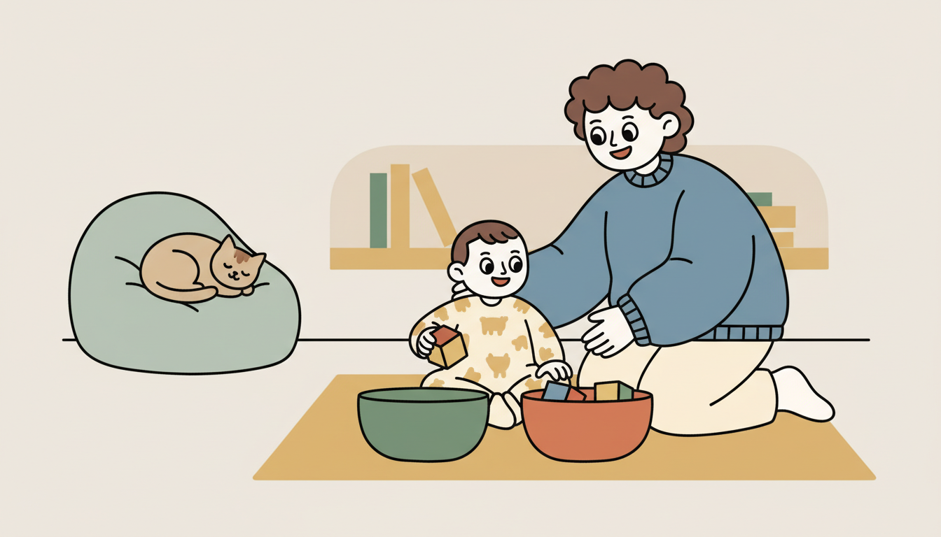 Provide two containers and a collection of similar items like blocks or small toys. Show your child how to put items in one container, then let them experiment with moving items between containers. They'll begin recognizing patterns and matching similar objects. Use everyday items like clean socks, spoons, or plastic cups. This activity builds early problem-solving skills through trial and error.