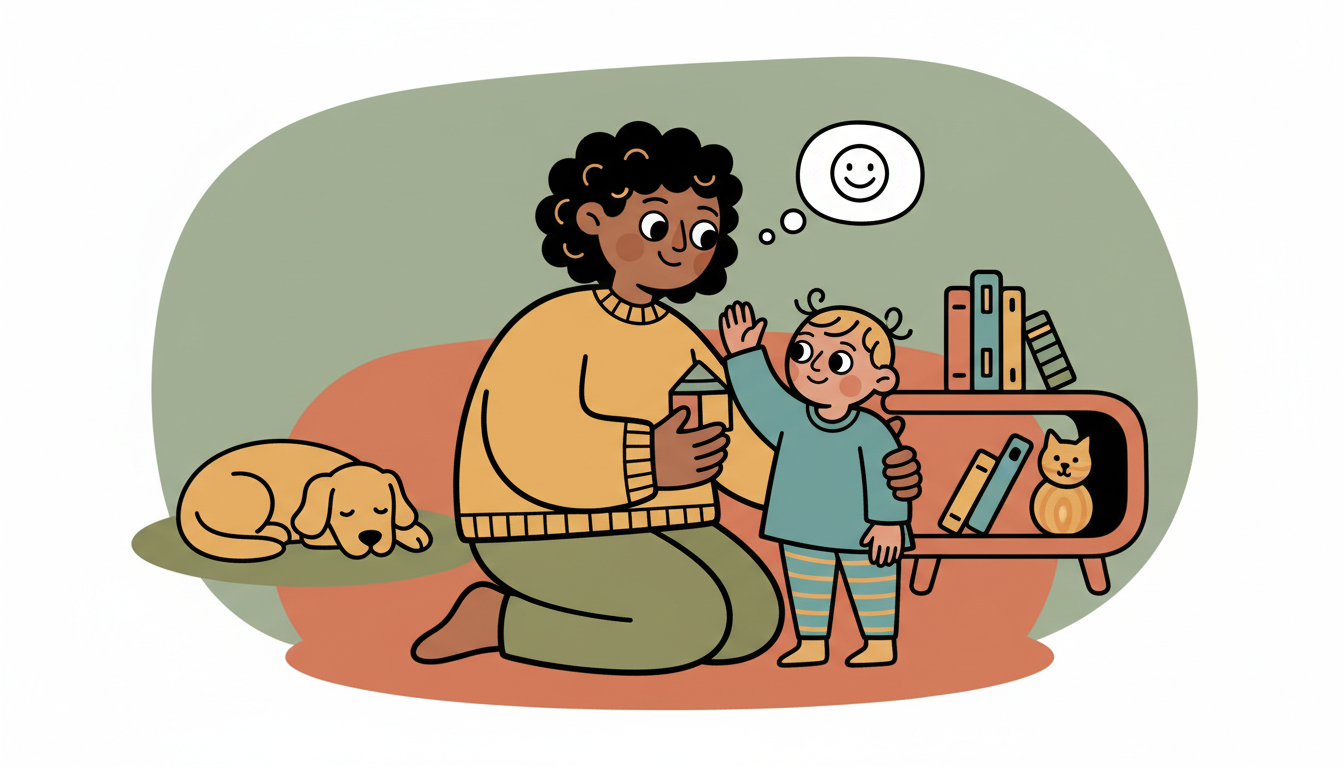 When someone hands your child a toy, snack, or book, model a gentle wave and say thank you. Guide your child's hand to wave too. Use a warm, clear voice each time. Your child learns to connect the action with receiving something kind. This works during playtime, meals, or any moment when someone offers help.