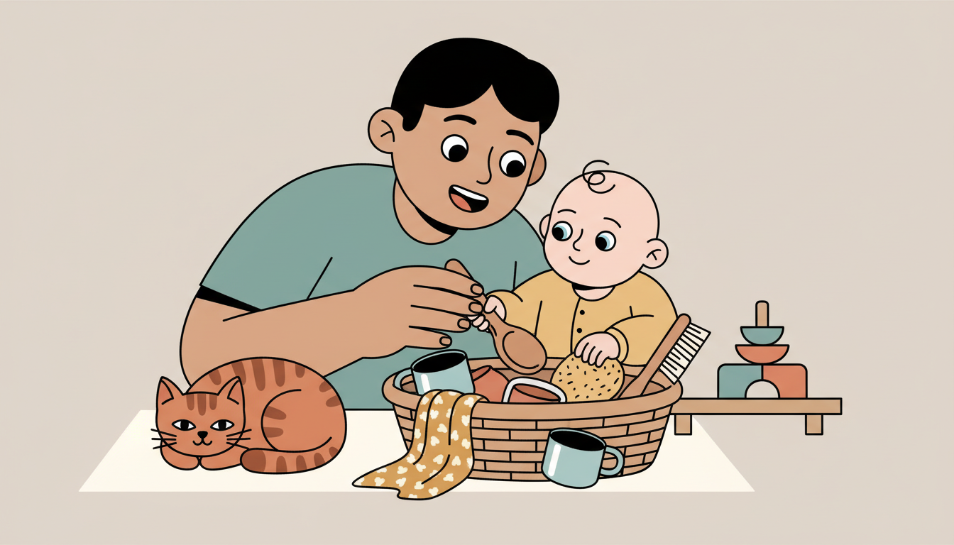 Fill a low basket with safe household objects of different textures, shapes, and materials. Let your child explore each item freely, touching, mouthing, and manipulating them. Choose items like wooden spoons, fabric scraps, metal measuring cups, natural sponges, and soft brushes. Sit nearby and observe as your child discovers each object at their own pace. Rotate items weekly to maintain novelty and interest.