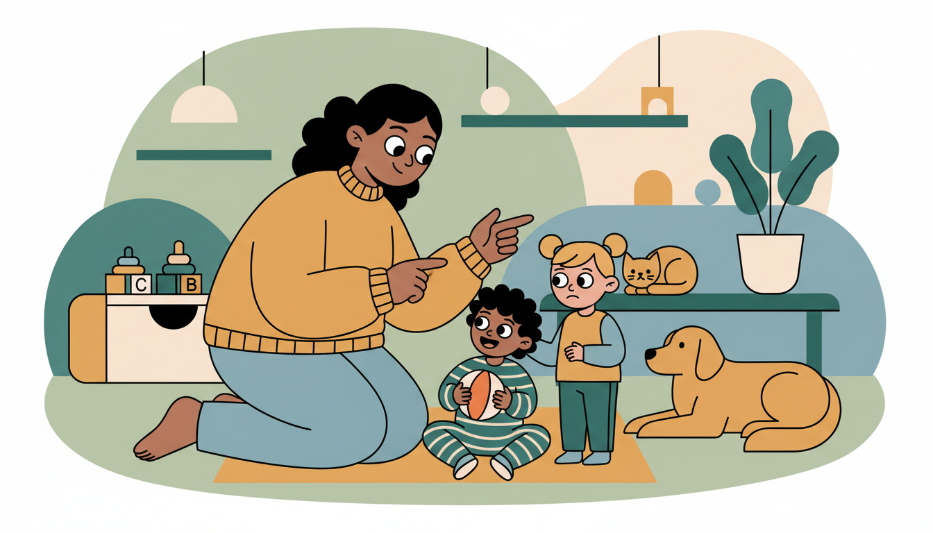 During conflicts between siblings or playmates, briefly acknowledge what each child wants using very simple language. Say 'You want the ball. She wants the ball.' This validates both perspectives. Then offer a simple solution like taking turns. This models fairness and helps children begin to see that both people matter in a conflict.