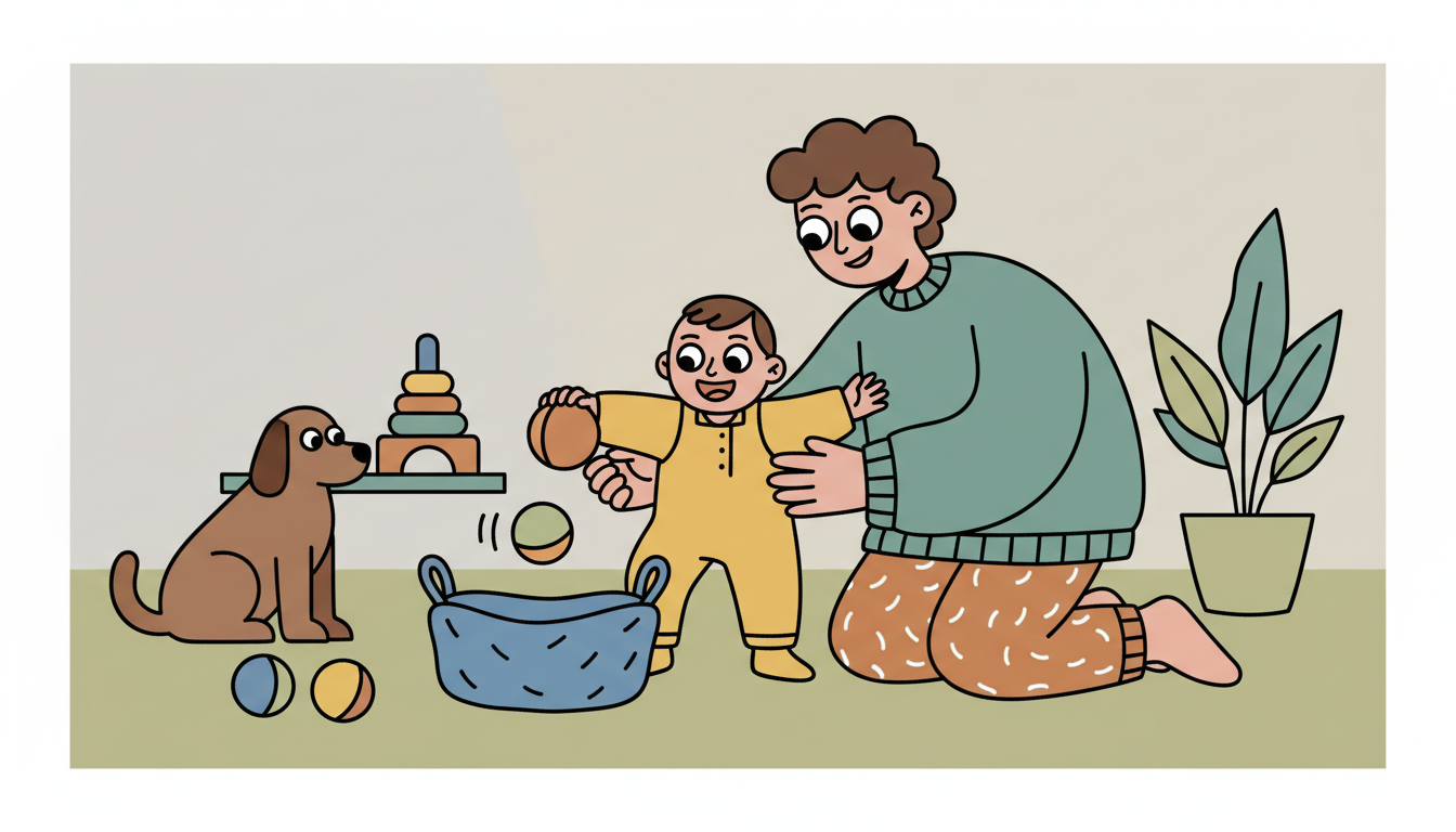 Give your child a soft ball and show them a target like a basket or box. Encourage them to throw the ball toward the target. Most throws will miss at this age. Each time, let them walk to get the ball and try again. You might say 'get the ball' and 'try again.' Continue for several minutes. The repetitive nature builds persistence as they practice the same action over and over.