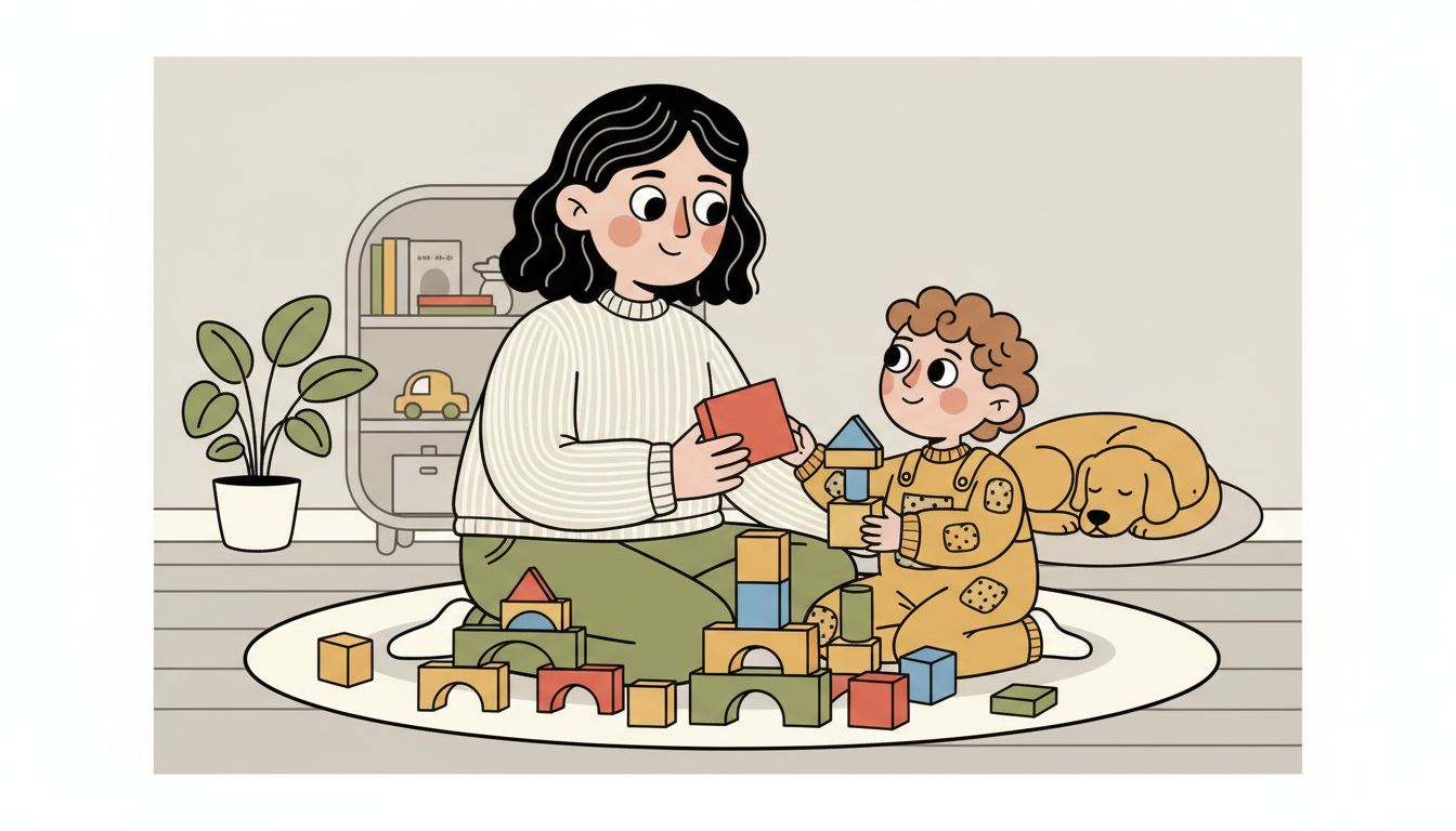 Give your child and yourself the same materials: a set of blocks for each of you. Build your own structures side by side. Comment on what your child is making. Occasionally share a special piece: 'I have an extra red block. Would you like it?' This parallel play sets the stage for cooperative play.