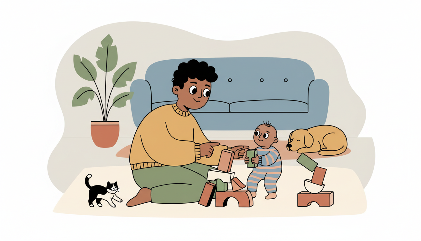 Set out four to six blocks and invite your child to stack them. Let them try on their own first. When blocks fall, say 'You're trying so hard' or 'Let's try again together.' Show them how you build your own tower and let it fall too. This helps them see that everyone needs practice and that falling blocks are part of learning, not failure.