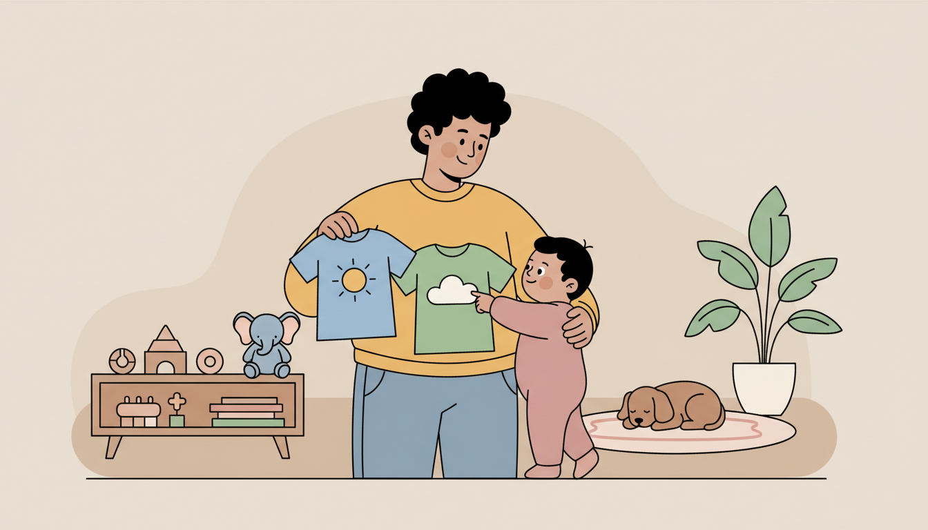 Let your child choose between two appropriate clothing items. Hold up two shirts and ask 'Which one?' Wait patiently while they look, point, or touch the one they want. Put that shirt on them, naming their choice: 'You chose the blue shirt.' This respects their developing sense of independence while keeping the choice simple and safe.