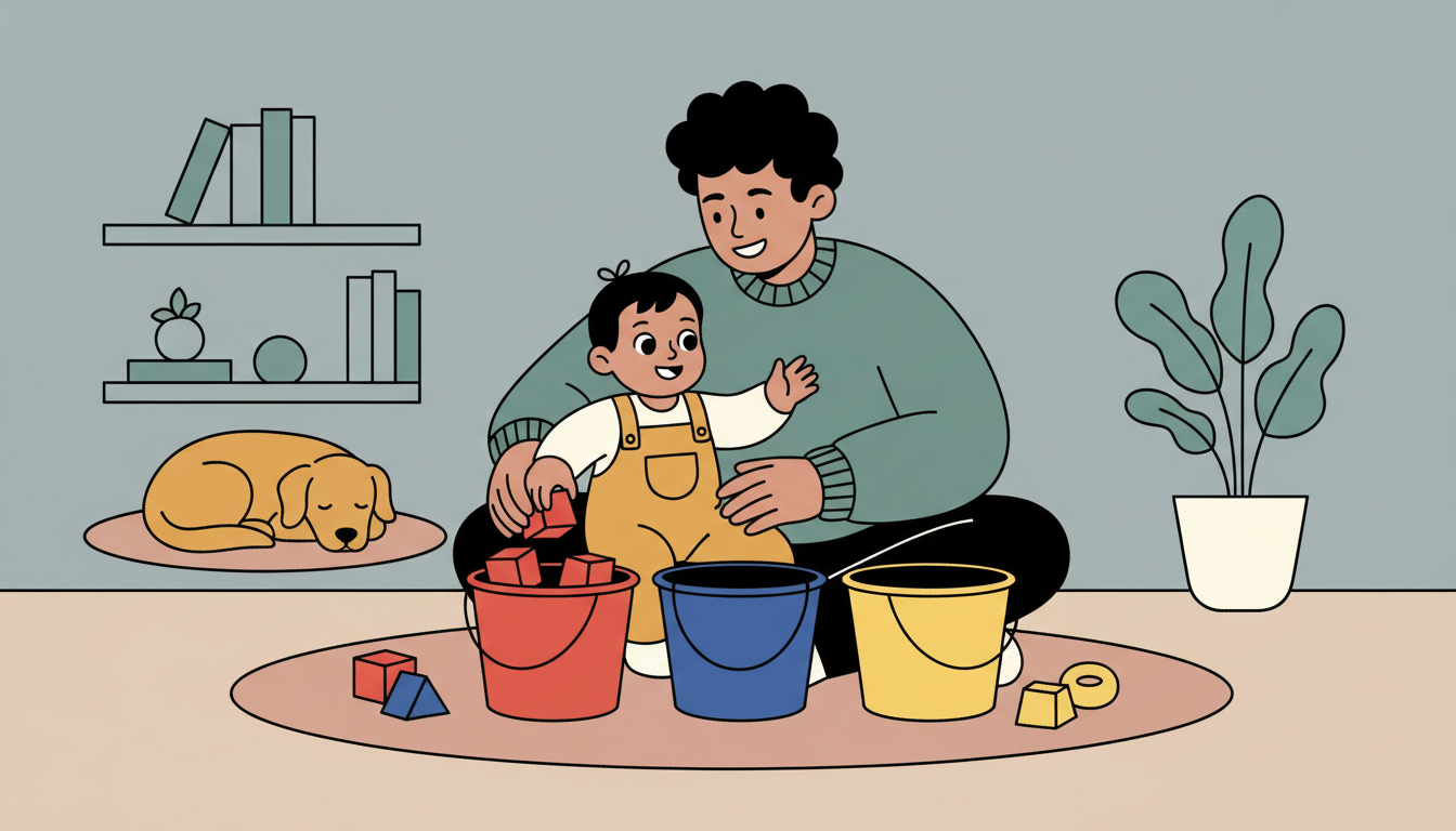 Use two or three buckets or bowls in different colors. Gather toys or blocks that match those colors. Help your child put red items in the red bucket, blue items in the blue bucket, and so on. Start with just one color at a time. Name the color as you place each item. This organizing activity builds categorization skills and attention to detail.