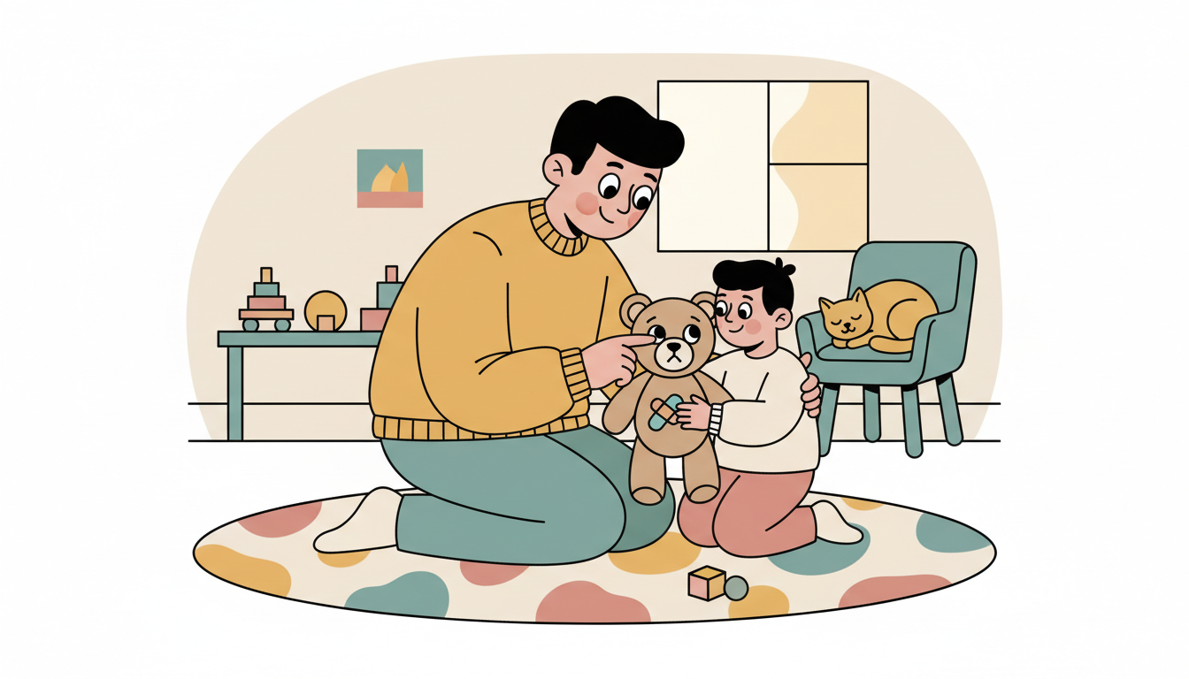 During activity time, set up scenarios where a stuffed animal or doll needs comfort. You might say, 'Oh no, teddy fell down and hurt his paw. Look at his face. How does he feel?' Then ask, 'What could we do to help teddy feel better?' Guide your child through comforting actions like gentle pats, kind words, or getting a pretend bandage. Talk about how these caring actions change how teddy feels. This safe practice builds real-world empathy skills.