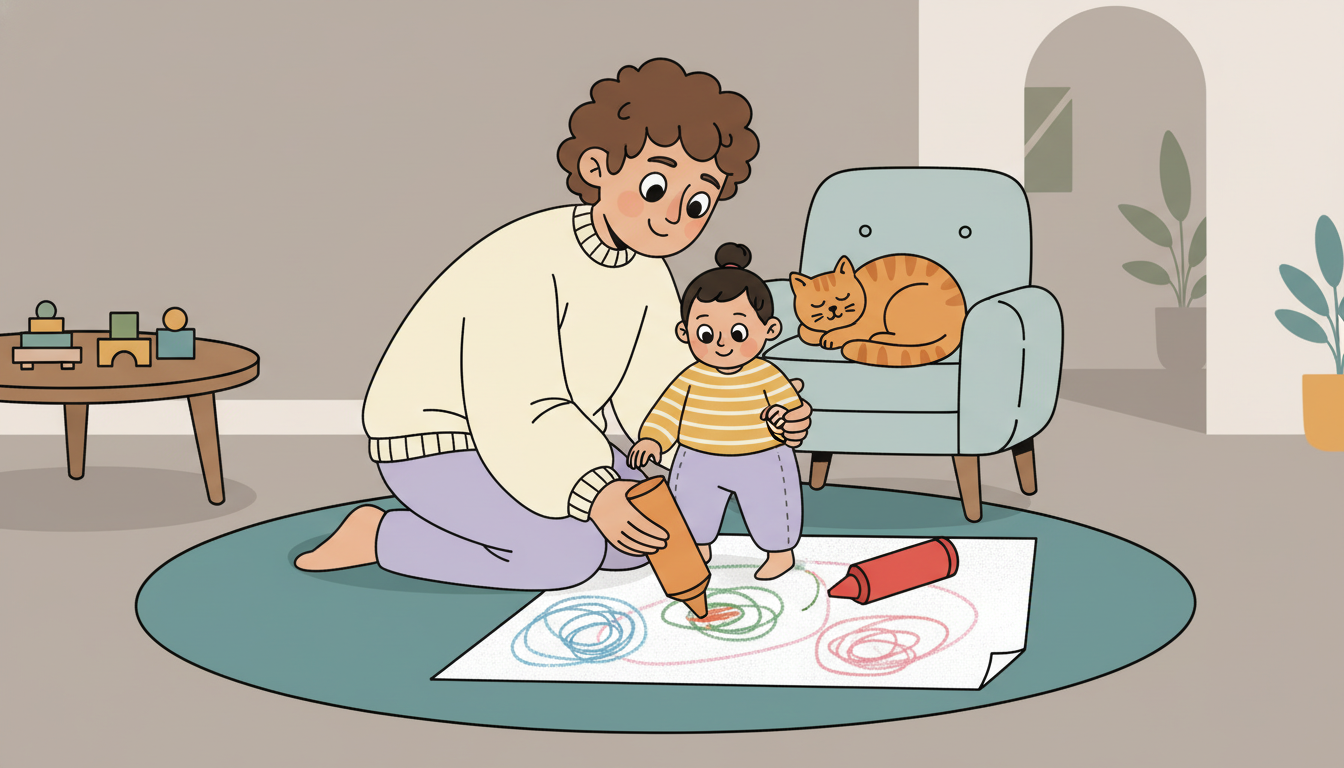 Give your child a large crayon and paper. As they scribble, they'll naturally drop the crayon or make marks they didn't intend. When this happens, narrate what you see. You dropped the crayon. Here it is. Or the crayon made a big mark. You can make more marks. This simple acknowledgment helps them understand that small frustrations are part of creating.