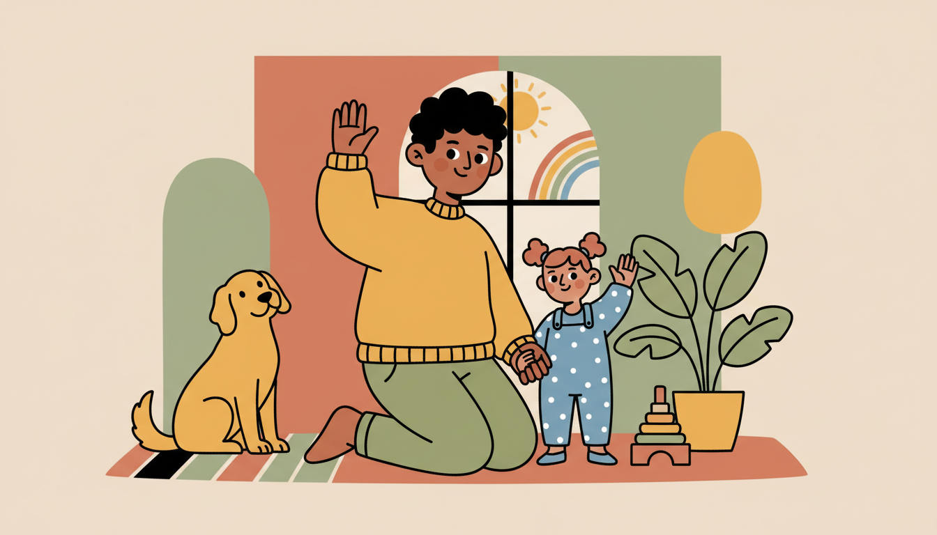Wave enthusiastically to encourage imitation. Practice with family members, pets, or even favorite toys. Be patient if they don't wave back every time.