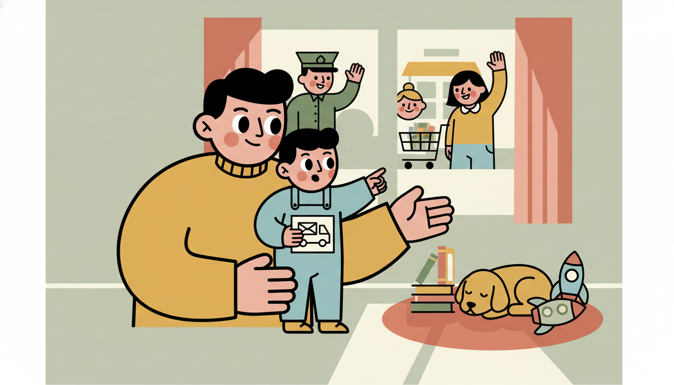 During the day, notice helpers together and talk about what they do. Point out the mail carrier who brings packages, the store clerk who helps you find items, or the neighbor who waves hello. Ask your child what each person did to help. Later, encourage your child to say thank you when they see helpers. This builds awareness that many people contribute to daily life.