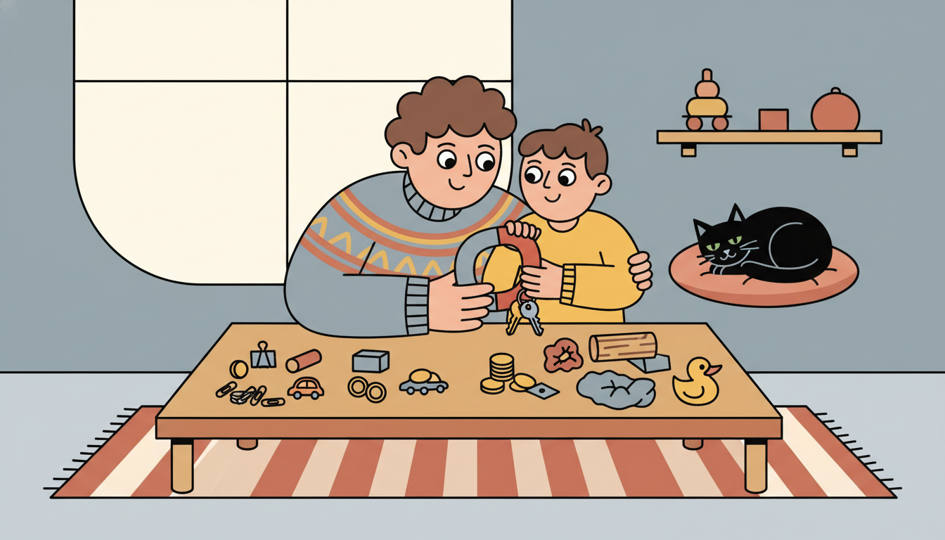 Give your child a magnet and a collection of household items. Let them test which objects stick to the magnet and which do not. They can sort items into two groups and discover patterns about what magnets attract. This hands-on investigation reveals invisible forces in a concrete way.