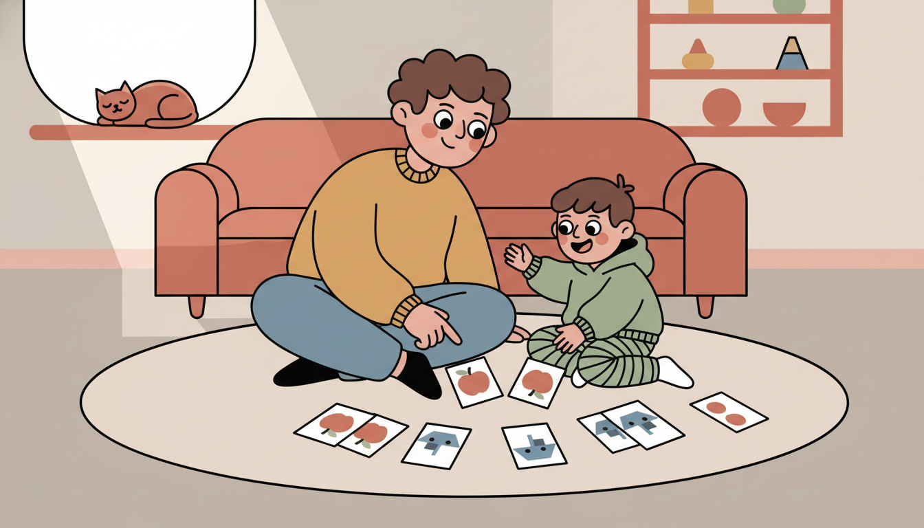 Create a simple memory game during playtime using everyday objects or cards. Place four to six pairs of items face down. Take turns flipping two items to find matches. Start with fewer pairs and increase difficulty as your child improves. This activity builds working memory and attention skills. You can use matching socks, pairs of toys, or draw simple matching pictures on cards.
