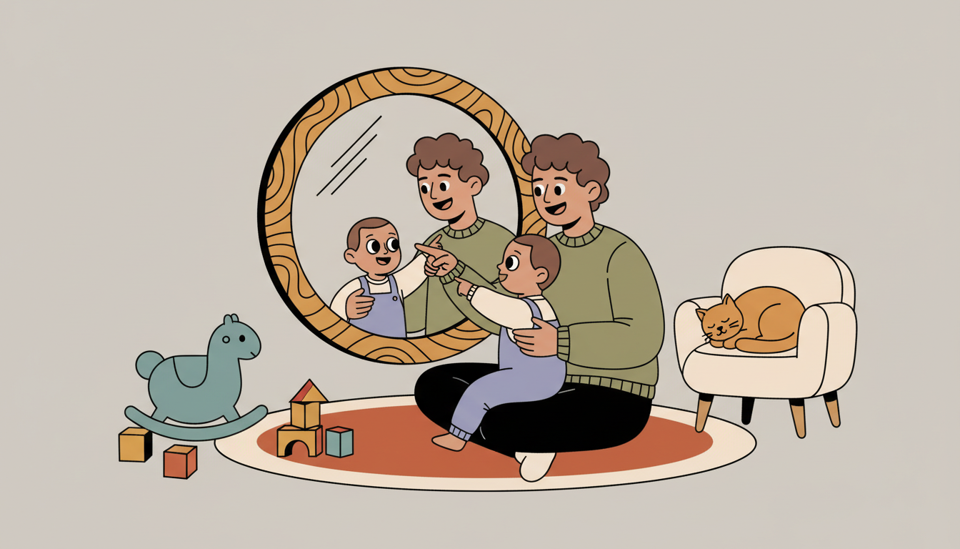 Sit or stand facing your child near a mirror where you can both see your reflections. Point to your child in the mirror and say their name with a smile. Then point to yourself and say your name or "mama" or "dada." Wave at the mirror together. Make funny faces and watch your child copy you. You can also gently touch your child's nose, then touch the reflection. This shared experience of seeing yourselves together reinforces your connection. The mirror becomes a tool for recognizing both self and the important people in their life.