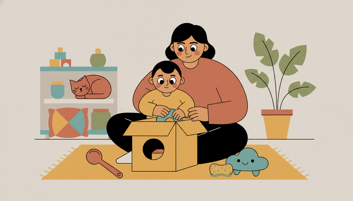 Place everyday objects in a box with a hole large enough for your child's hand. Let them reach in and explore items by touch before pulling them out. Use safe household items like a wooden spoon, soft toy, or clean sponge. Watch as they figure out what each item is through touch alone. This simple activity turns ordinary objects into exciting discoveries.
