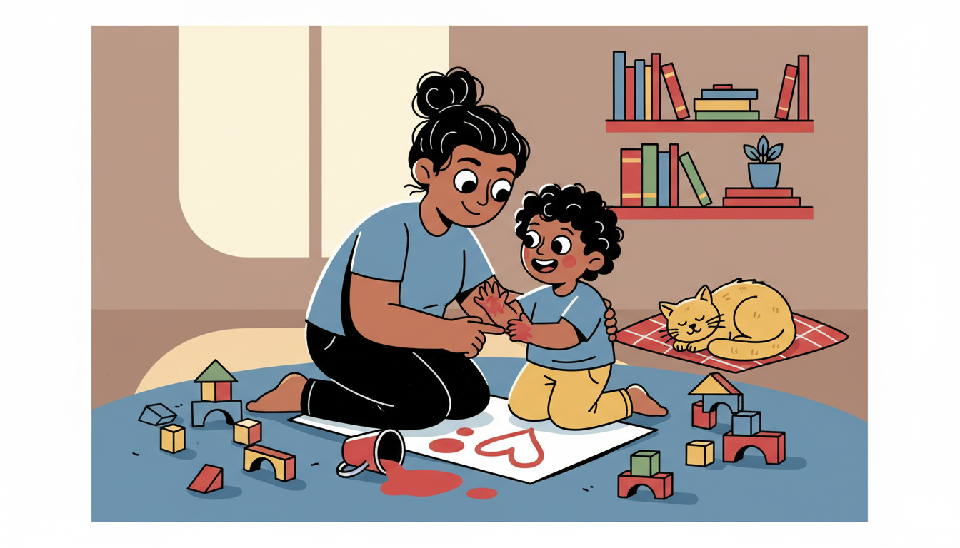 During art or building activities, when something goes wrong, make it part of the fun. If paint spills or blocks fall, say "Oops, let's see what we can do." Model staying calm and trying again. This teaches that mistakes happen to everyone and we can handle them without getting too upset.
