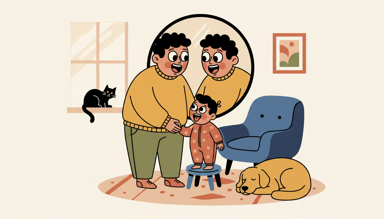 Stand together in front of a mirror and make silly faces at each other. Take turns choosing expressions to try. Laugh together, make eye contact through the mirror, and enjoy the playfulness. You might try happy faces, surprised faces, or invented expressions. Keep the mood light and affectionate.