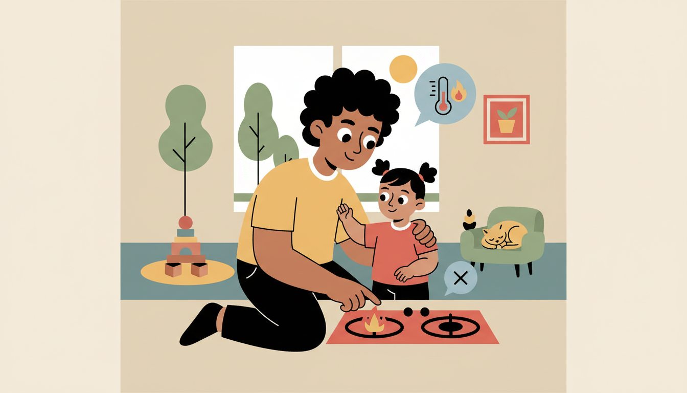 When you need to set a limit, give one simple reason in everyday words. For example, 'Hot. We do not touch' while pointing to the stove. Or 'Sharp. I will hold it' when moving a knife. Use one or two short sentences. Your calm, simple explanation helps your child understand that rules have reasons, not just power.