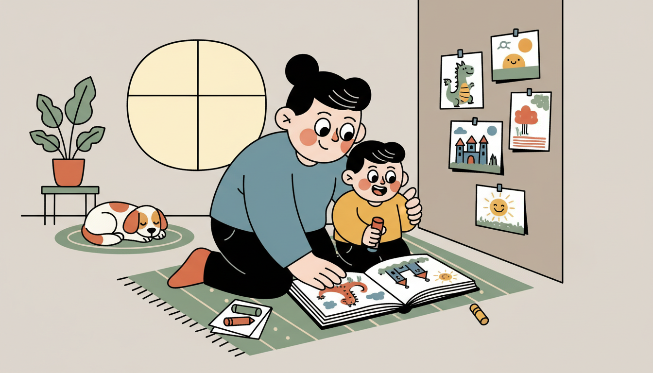 Create an ongoing story together, adding one chapter each day for a week. Your child contributes ideas for what happens next. Draw pictures for each installment and keep them together in order. This builds narrative skills while practicing sustained creative commitment to a multi-day project.