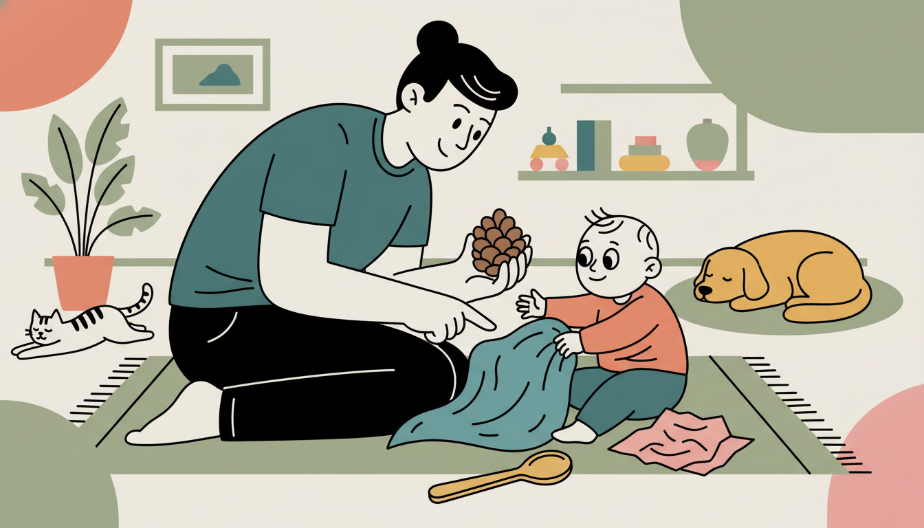 Gather items with different textures from around your home and let your child explore each one. Include things like a soft blanket, bumpy pinecone, smooth wooden spoon, or crinkly paper. Spread them on the floor and watch your child move from one to another, touching and examining. Name each texture as they explore. This activity turns your home into an exciting sensory discovery zone.