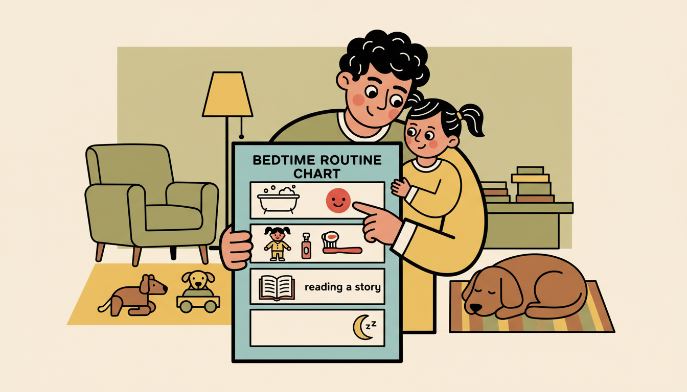 Create a visual chart showing each step of the bedtime routine with simple drawings or pictures. Include steps like bath time, putting on pajamas, brushing teeth, reading a story, and lights out. Your child can check off or move a marker through each step. This makes the routine predictable and gives your child some control over the process.