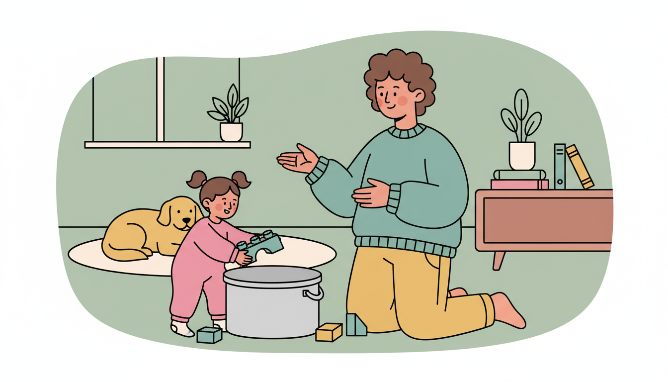When play time ends, make cleanup a cooperative game. Give your child a simple job: 'You put the blocks in the bin, and I'll put the books on the shelf.' Work side by side, narrating what you each are doing. Celebrate when the room is tidy: 'We did it together.'