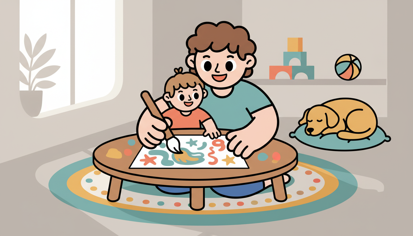 Create one piece of art together where you each contribute. You might take turns adding to a drawing, build a collage together, or paint on the same paper. Discuss your ideas and make decisions together about colors, placement, and additions. This creates a shared accomplishment.
