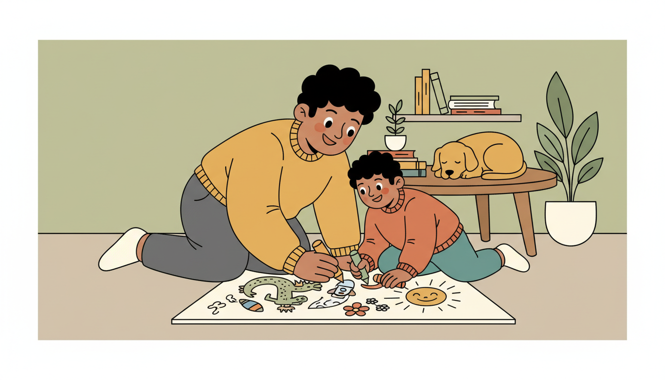 Start a drawing together where you take turns adding to the picture. One person draws something, then the other adds to it. Keep going back and forth until you create something together. There's no right or wrong outcome. The fun is in creating something neither of you would make alone. Talk about your choices and enjoy the surprises.