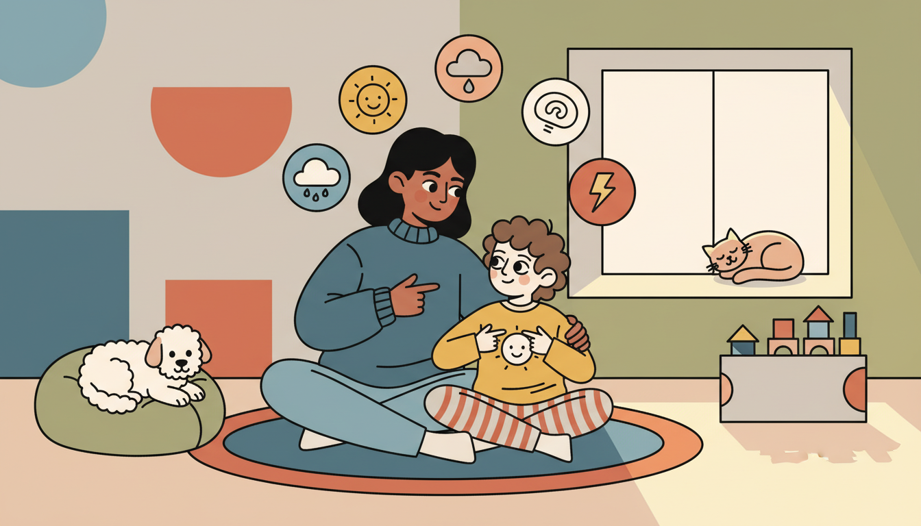 Sit together during activity time and take turns sharing how each person feels right now and why. You might start by saying, 'I feel tired because I worked hard today. How do you feel?' Encourage your child to name their feeling and explain it. Then ask, 'What would help you feel better?' or 'What made you feel that way?' This regular practice helps your child become aware of their own emotions and understand that others have feelings too.