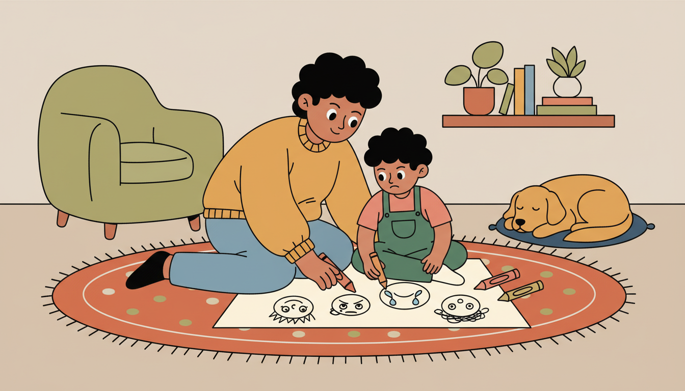 During your time together, draw different emotion faces with your child. Start with basic emotions like happy, sad, angry, and scared. Then introduce complex emotions like frustrated, disappointed, proud, or embarrassed. Take turns drawing and naming emotions. Talk about times when you each felt these emotions. This builds emotional vocabulary in a fun, creative way.
