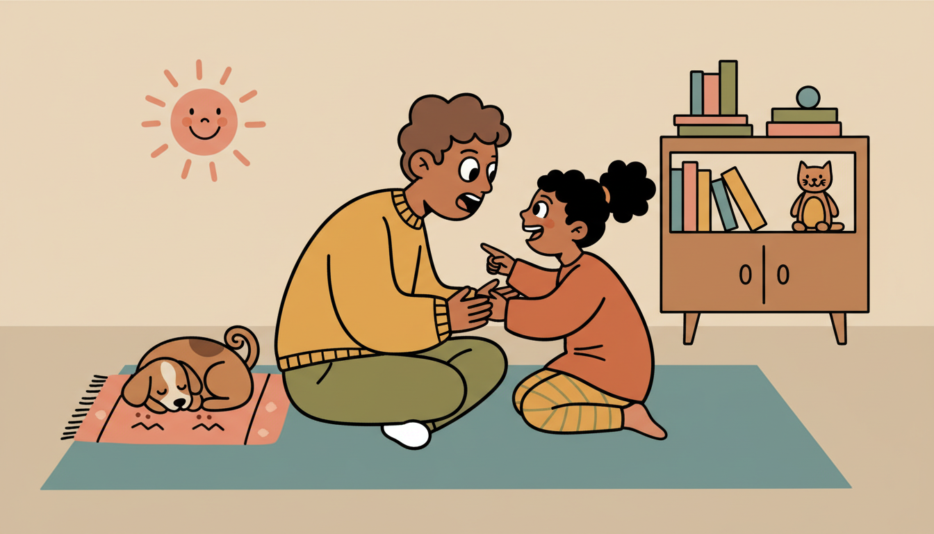 Sit together and take turns making facial expressions that show different emotions. Have your child guess what emotion you are showing, then switch roles. Start with basic feelings like happy, sad, angry, and scared, then add more complex ones like frustrated, proud, or worried. This simple game helps your child learn to read emotions from faces, a key skill for understanding how others feel.