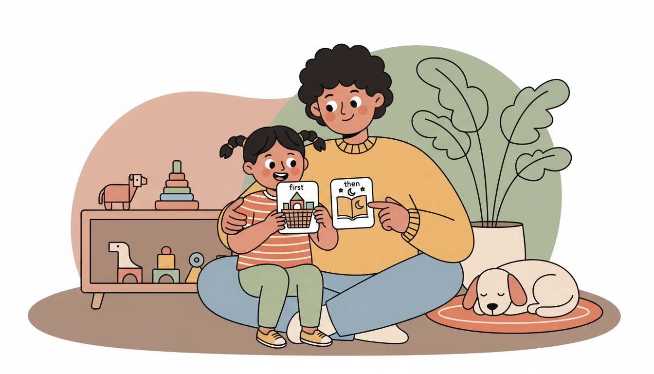 Create simple cards showing a less preferred activity and a more preferred one. Show your child both cards and explain "First we do this, then we do that." For example, first we clean up toys, then we read a story. This visual tool helps your child practice waiting and builds their ability to delay gratification for something they want.