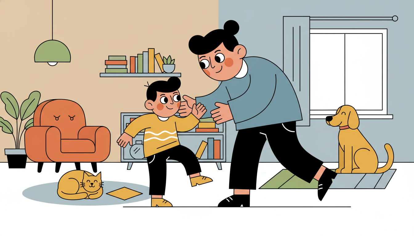 Take turns being the leader who chooses movements for everyone to copy. The leader might skip, jump on one foot, march with high knees, or do silly walks. Switch leaders every minute or two. This activity builds leadership skills, body awareness, and cardiovascular fitness. It works well with siblings, friends, or just parent and child taking turns leading each other.